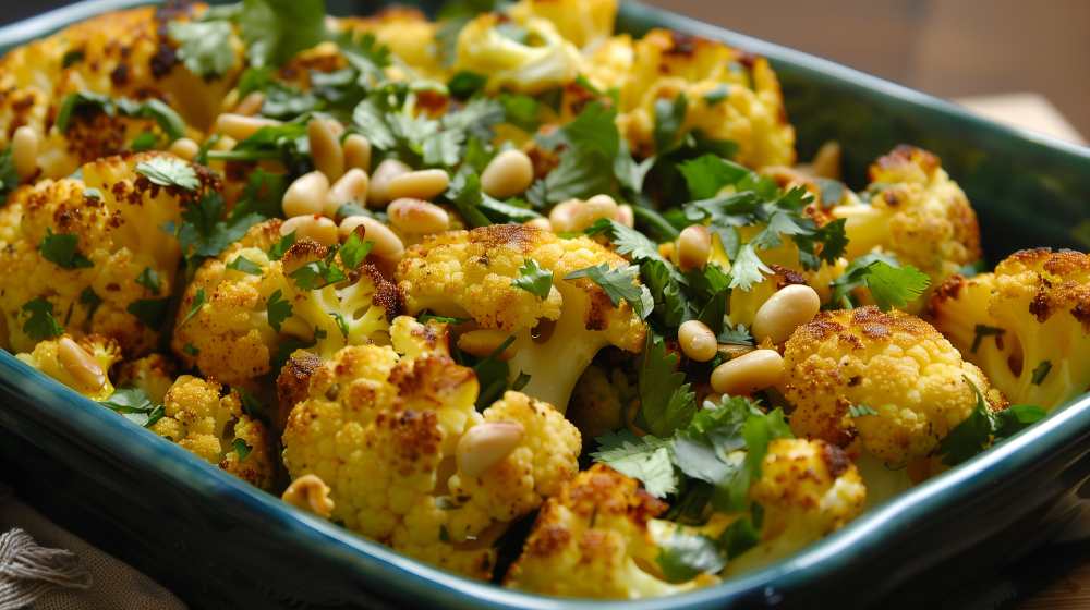 This roasted cauliflower dish is warm, aromatic, and quietly satisfying.Gentle spices coat the florets as they roast, creating deep flavor without heaviness.Toasted pine nuts add a light crunch that balances the texture.Fresh cilantro finishes the dish with brightness.A simple vegetable recipe that feels both comforting and complete. Roasted cauliflower with cumin, coriander, and turmeric topped […]