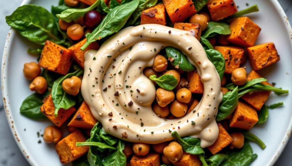 Roasted Sweet Potato Cubes with Chickpeas, Spinach & Tahini Sauce