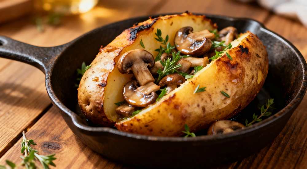 This baked potato dish is warm, rustic, and deeply comforting.Potatoes bake until tender, then open to hold savory mushrooms and herbs.Sautéed mushrooms add gentle depth while fresh herbs bring brightness.The preparation stays simple and balanced.A steady, satisfying dish that fits easily into everyday meals. Baked potatoes with mushrooms and herbs cooked in a cast […]