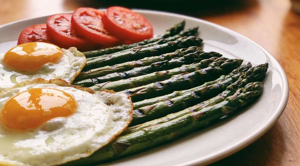 Sunny Side Up Eggs with Grilled Asparagus and Sliced Tomatoes