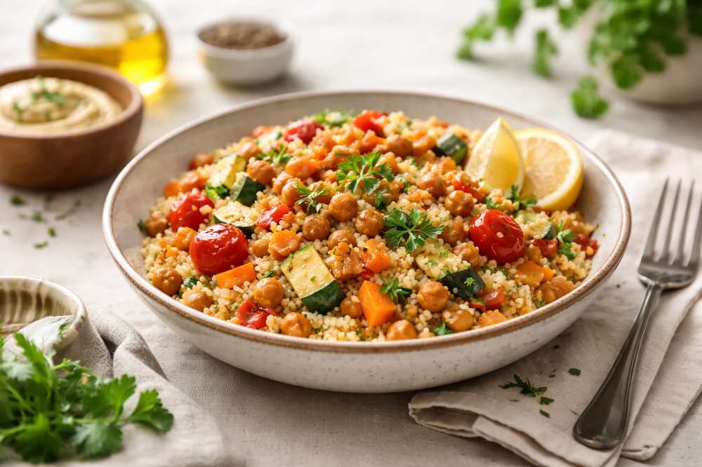 This couscous dish is simple, warm, and quietly nourishing.Roasted vegetables bring depth while chickpeas add gentle balance.The grains absorb the flavors easily without becoming heavy.Fresh herbs and lemon finish the dish with brightness.A dependable meal that fits naturally into everyday cooking. Couscous with roasted vegetables, chickpeas, herbs, and lemon for a simple and nourishing vegetarian […]
