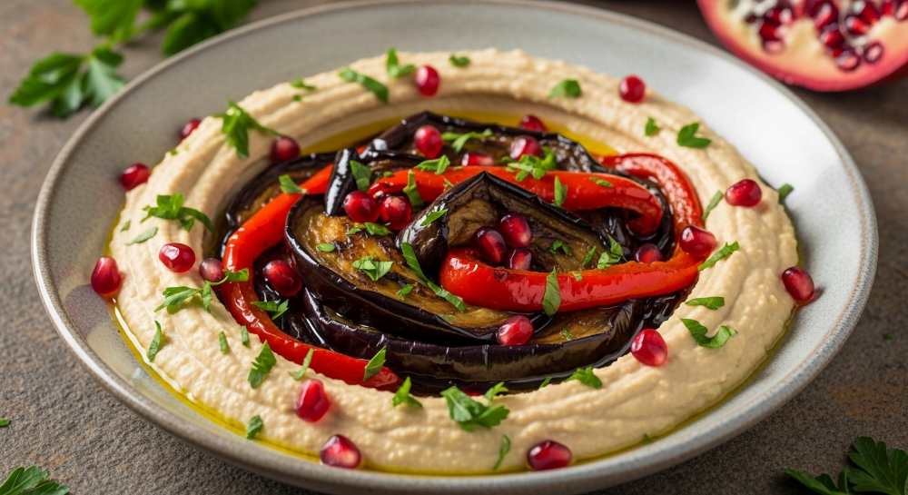 This hummus dish is rich, balanced, and quietly elegant.Creamy hummus forms a smooth base while fried eggplant adds warmth and depth.Pomegranate seeds bring a gentle sweetness that lifts the flavors.The combination is simple yet visually inviting.A satisfying appetizer that feels both comforting and fresh. Hummus topped with fried eggplant and pomegranate seeds for a rich […]