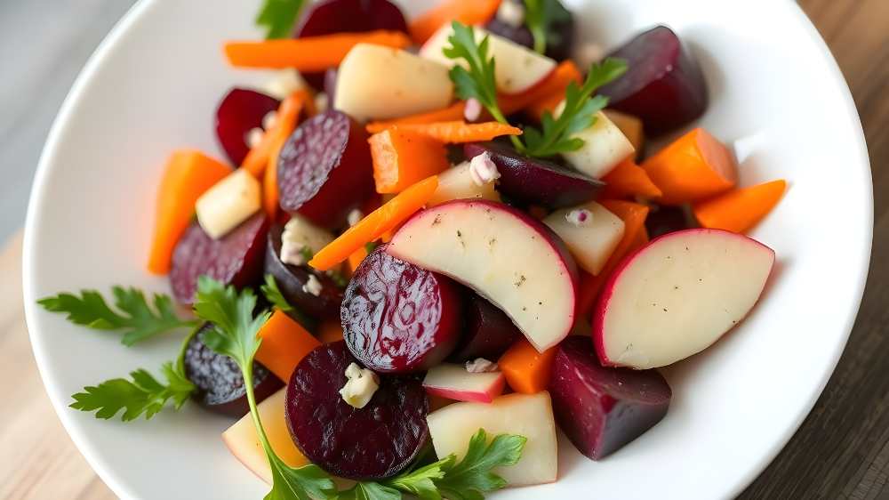 Beetroot salad with carrots, apple, blue cheese, and parsley for a balanced plant-forward everyday side dish.