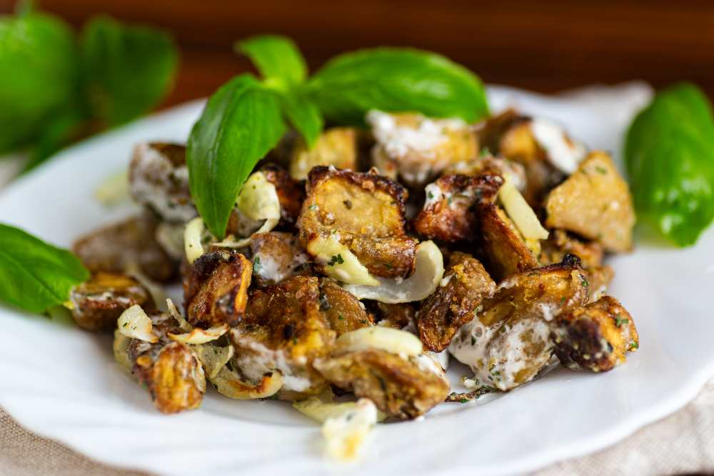 6. Serve fried eggplant and onion topped with creamy garlic sauce.
