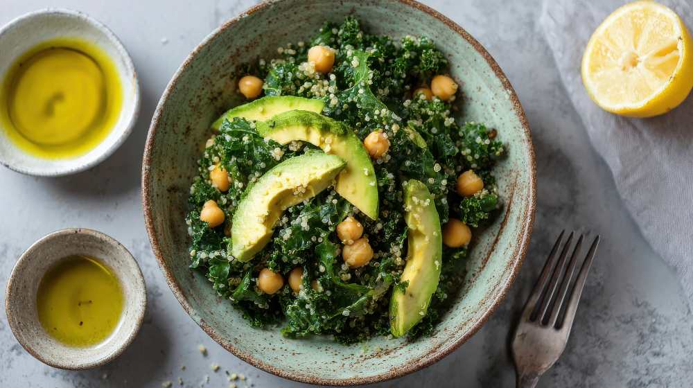 Kale and quinoa salad with avocado and chickpeas. A healthy, plant-forward meal with olive oil and lemon for fresh, balanced eating.