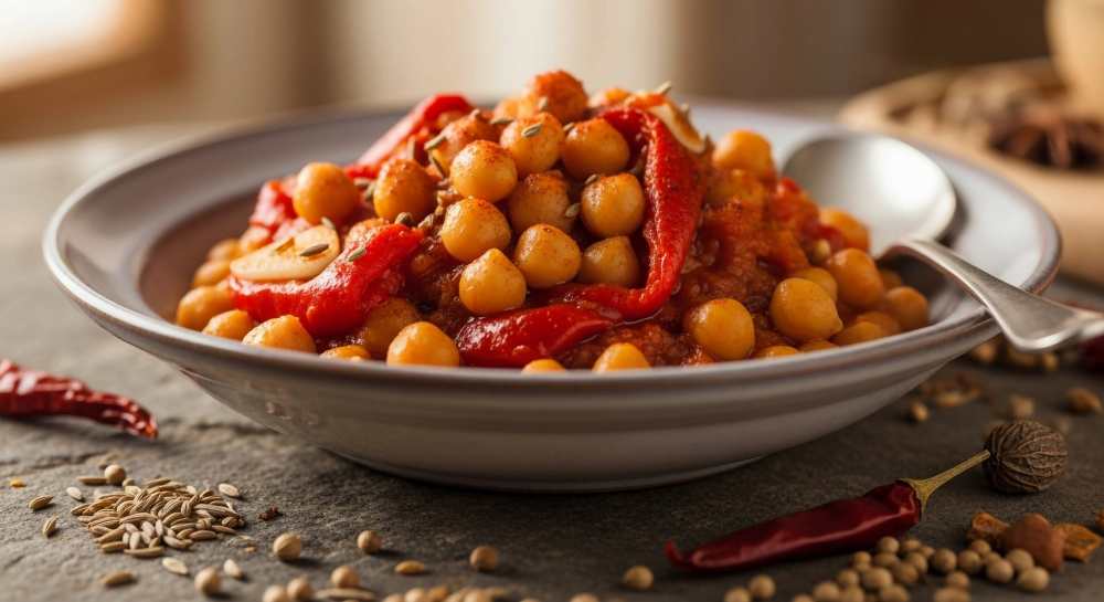 Spicy chickpea stew with red peppers and tomato sauce for a balanced plant-forward everyday comfort dish.
