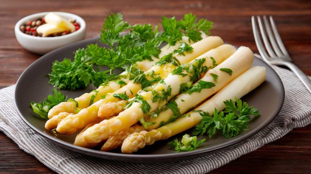 White asparagus with butter and fresh parsley cooked simply and tender. A classic Let’s Veg recipe perfect for light, elegant side dishes.