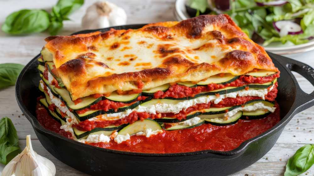 Zucchini lasagna with tomato sauce and ricotta baked in cast iron for a simple, comforting vegetarian dish.